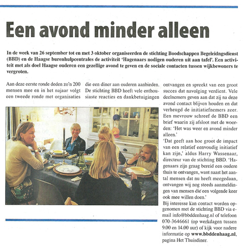 In het Haags Nieuwsblad van 13 maart 2014 verscheen onderstaand artikel over Het Thuisdiner: